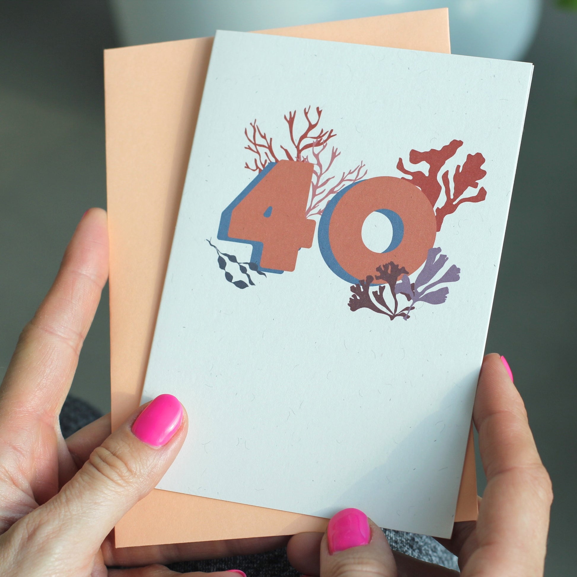 A lovely eco-friendly 50th Birthday card, featuring the number 40 surrounded by sea coral and ocean botanical illustrations. A super beachy birthday card to send a friend, sister, mum or girlfriend celebrating their milestone 40th birthday.