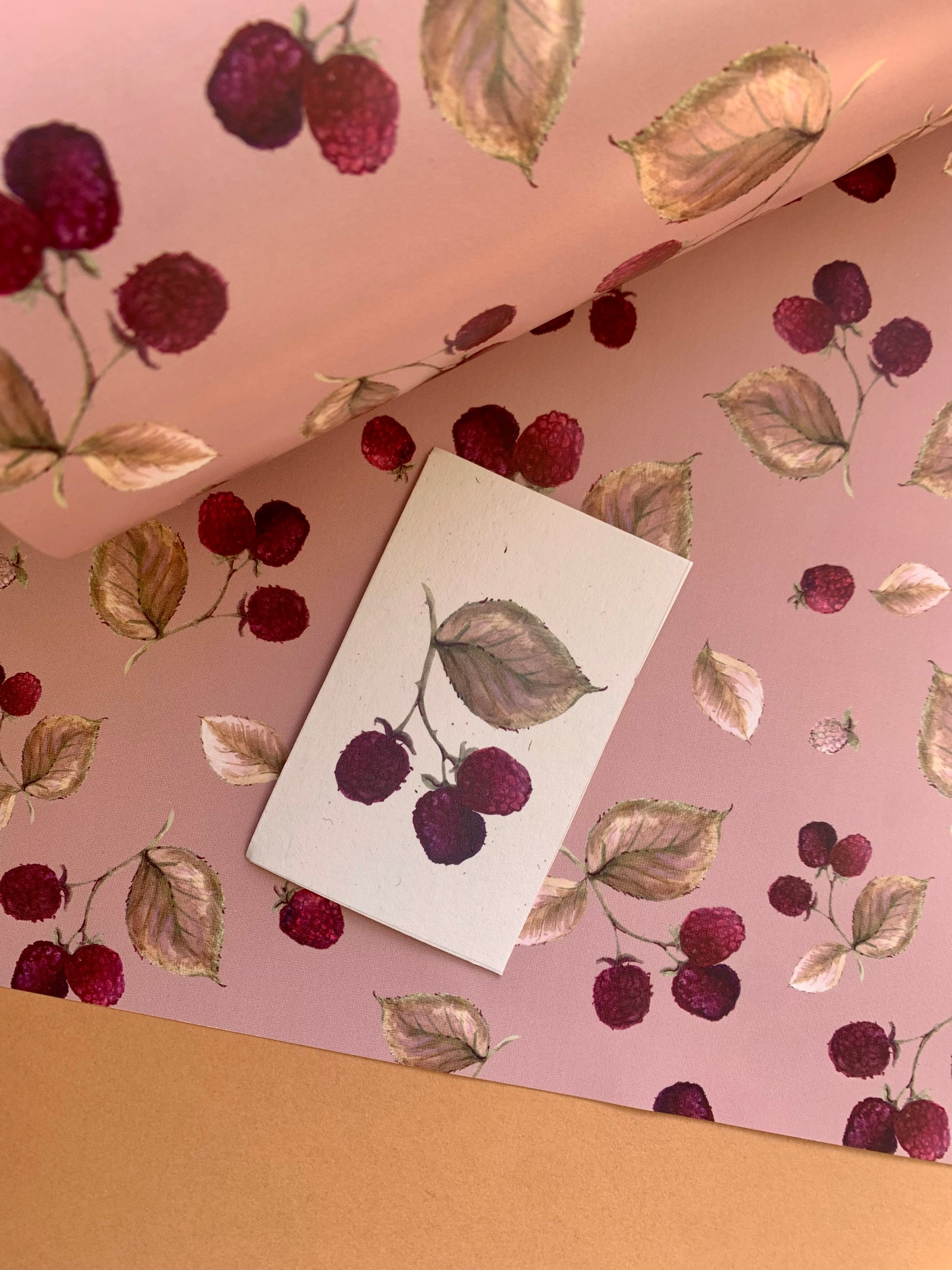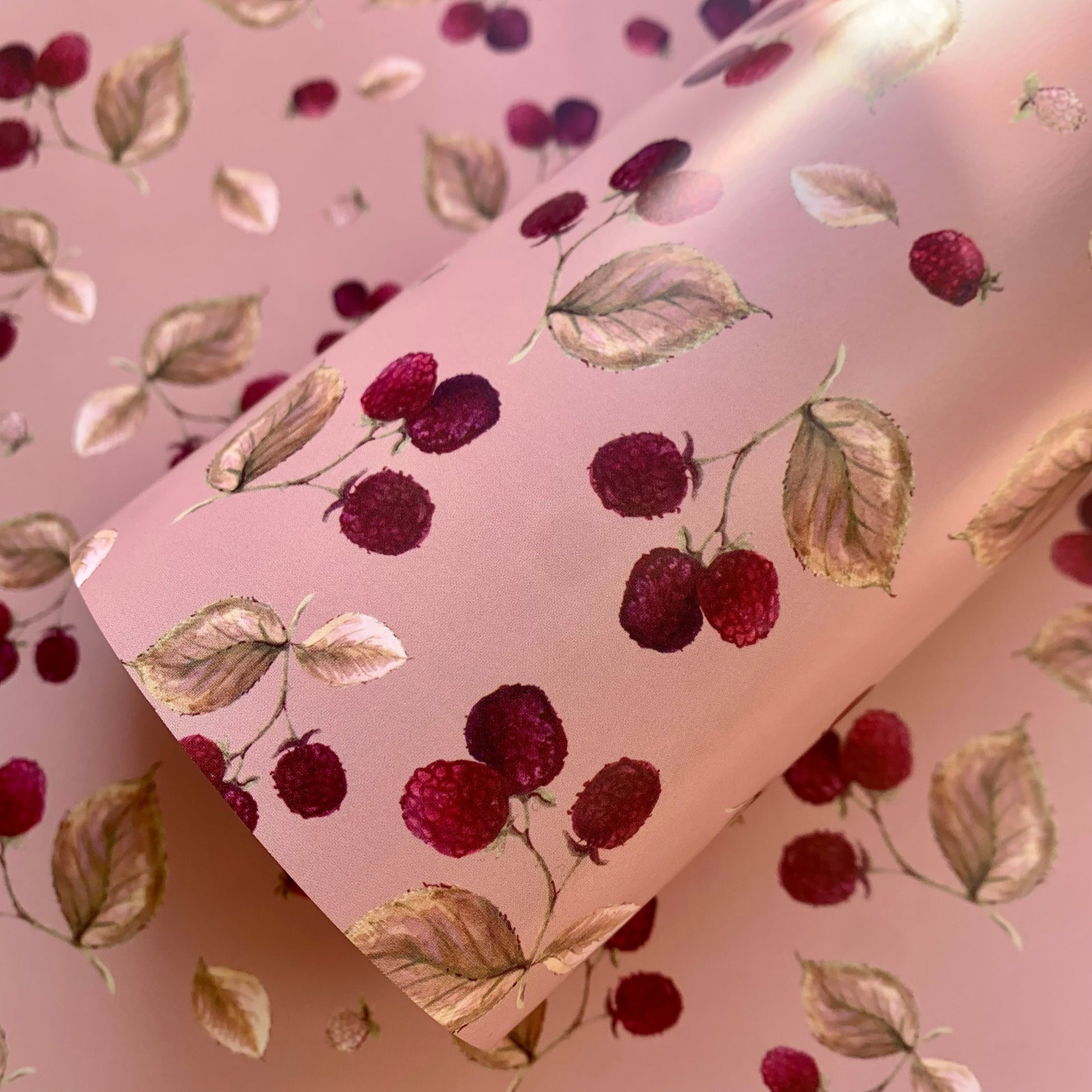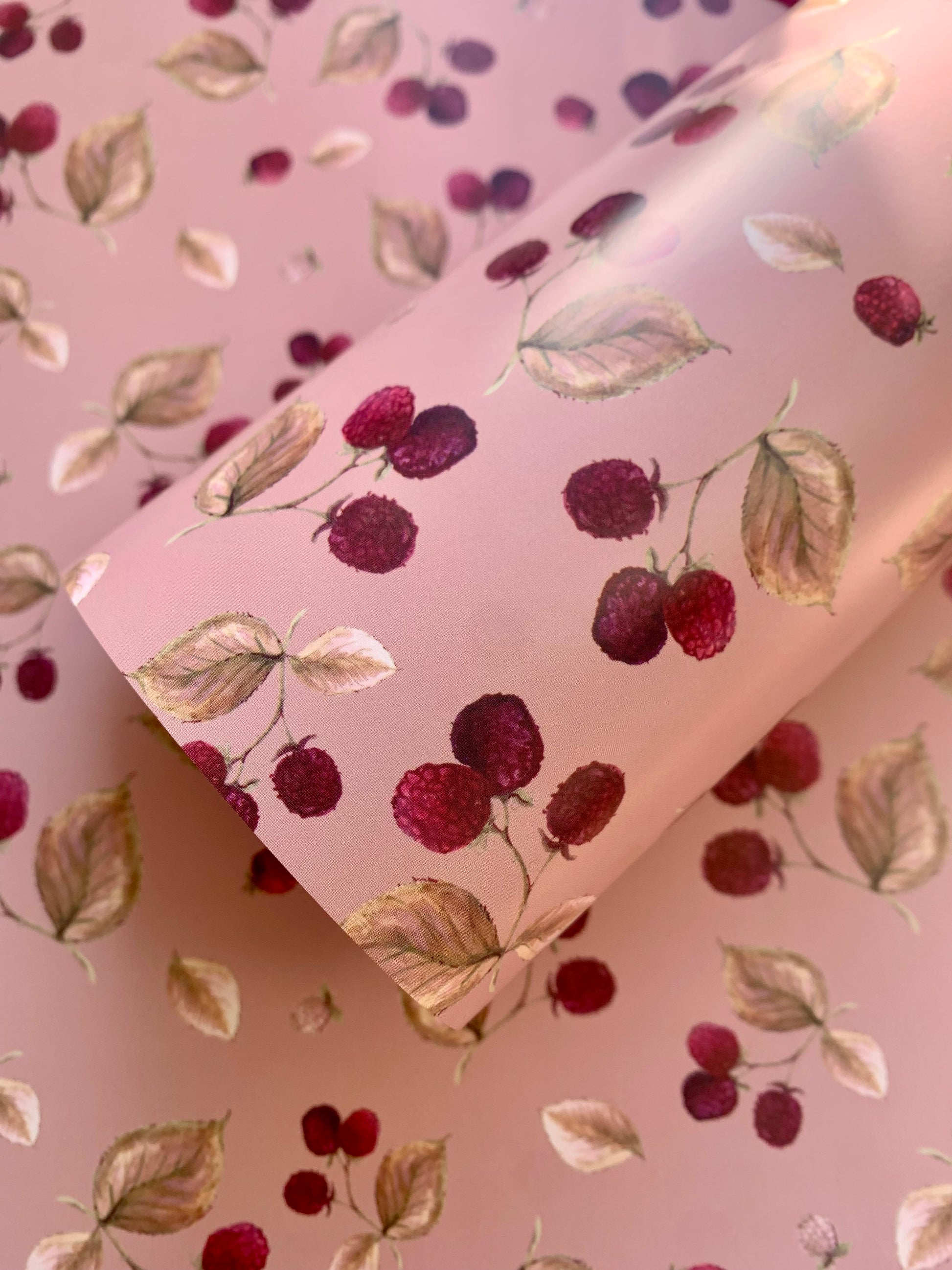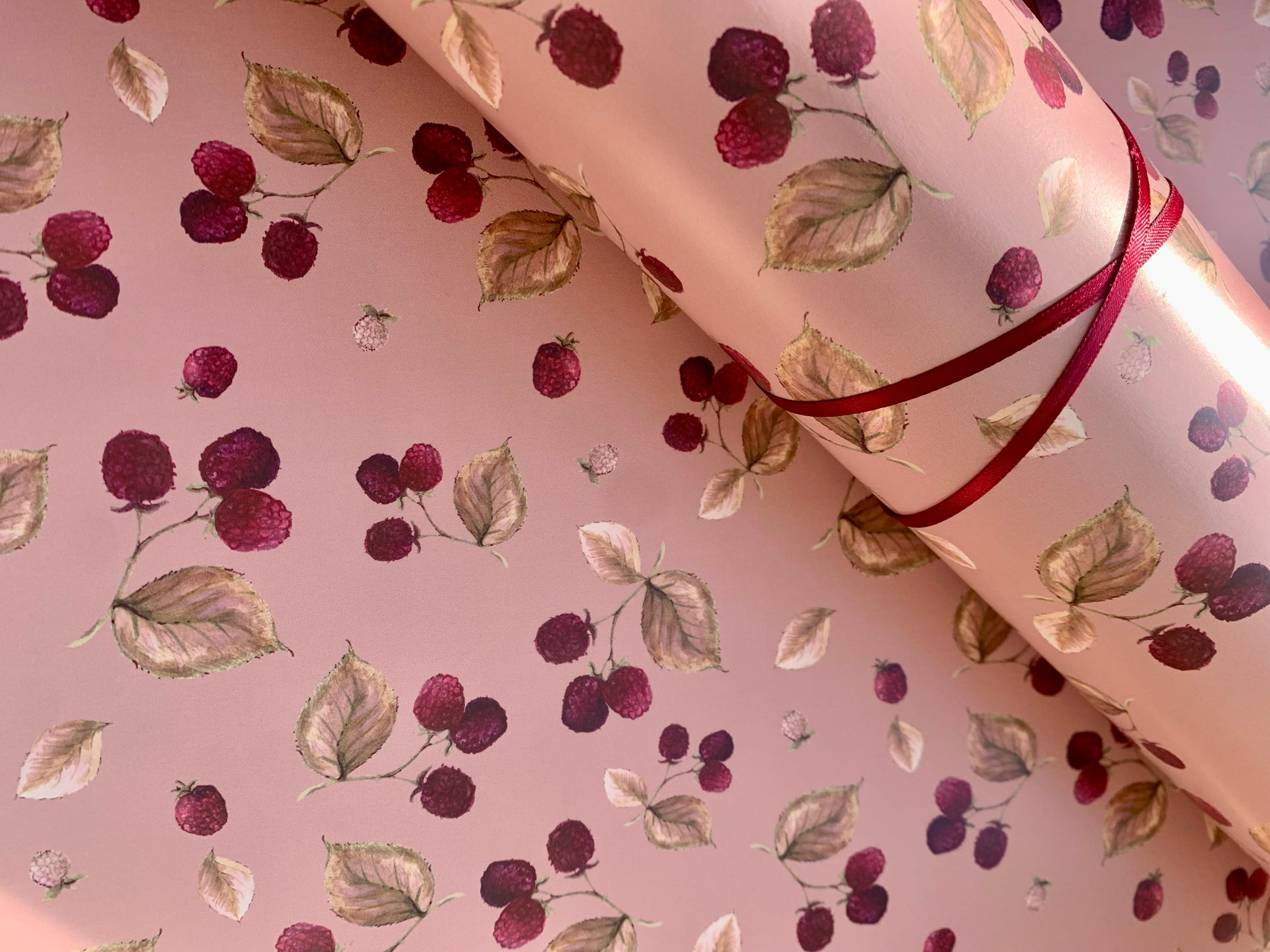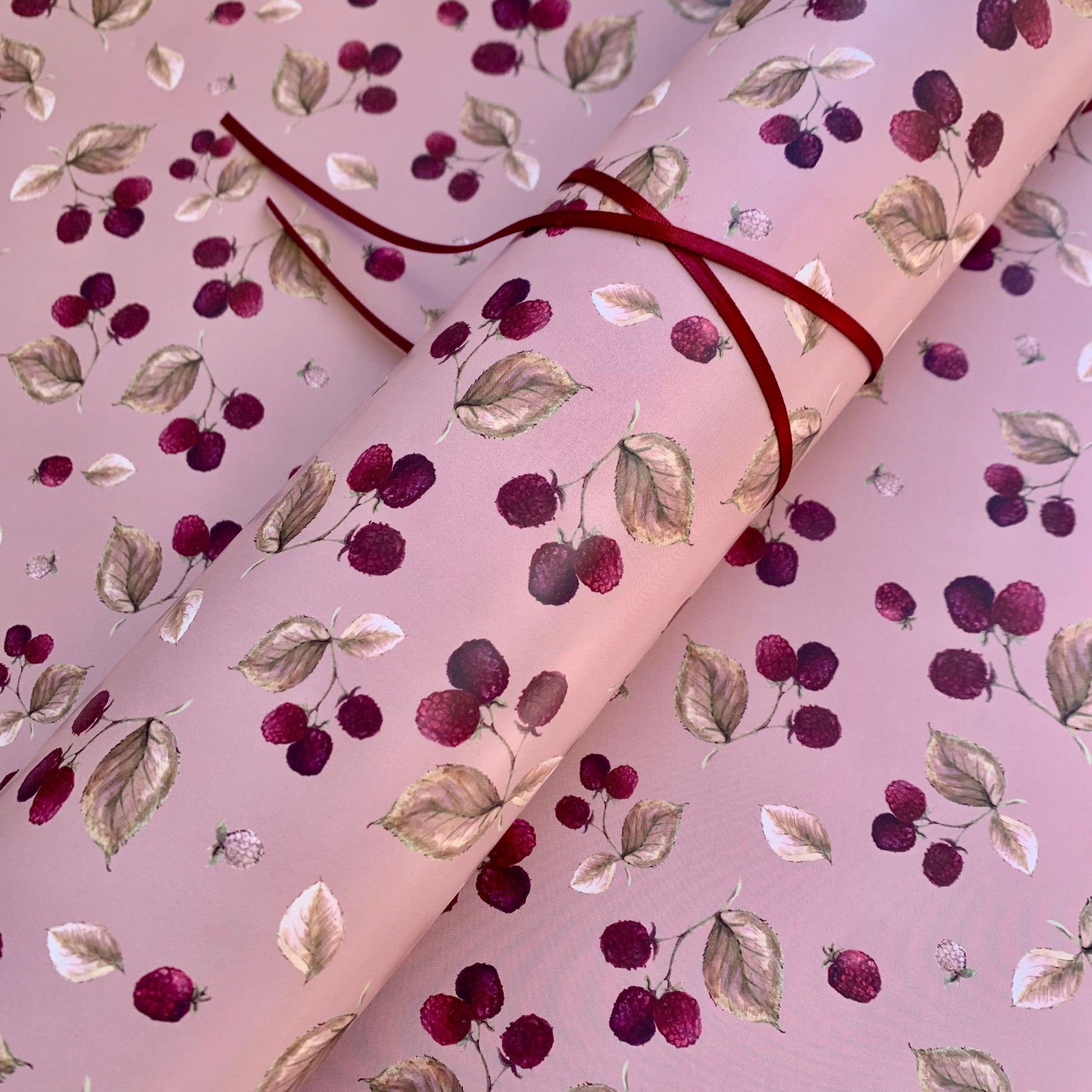 Vintage ditsy raspberry print pink coloured wrapping paper featuring cute berry botanical illustrations in purples, pinks and reds shades. This would be perfect for wrapping Christmas gifts for foodies, foragers and gardeners.