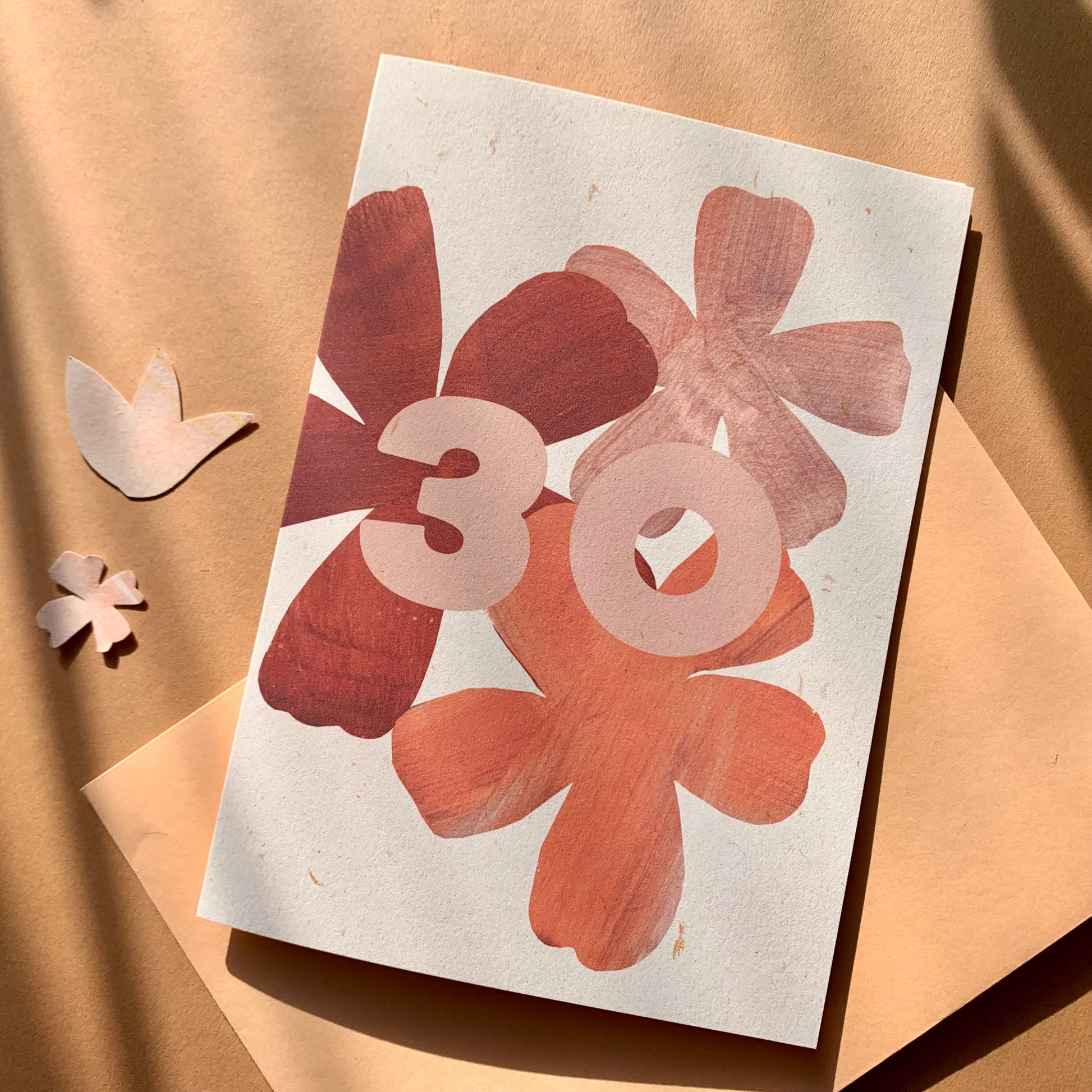 This abstract floral 30th birthday card would be perfect for an eco conscious friend or an arty friend who loves flowers. It features lovely coral and burnt orange flower shapes and the number 30 in a bold modern font.