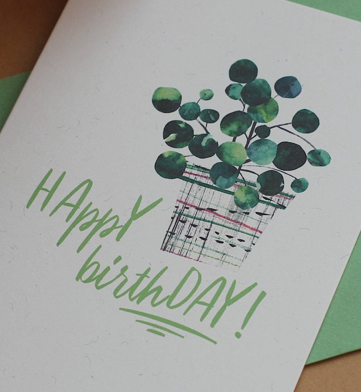 Cute eco friendly plant birthday card featuring a pilea pot plant illustration. A great birthday card for plant lovers or Gardeners.