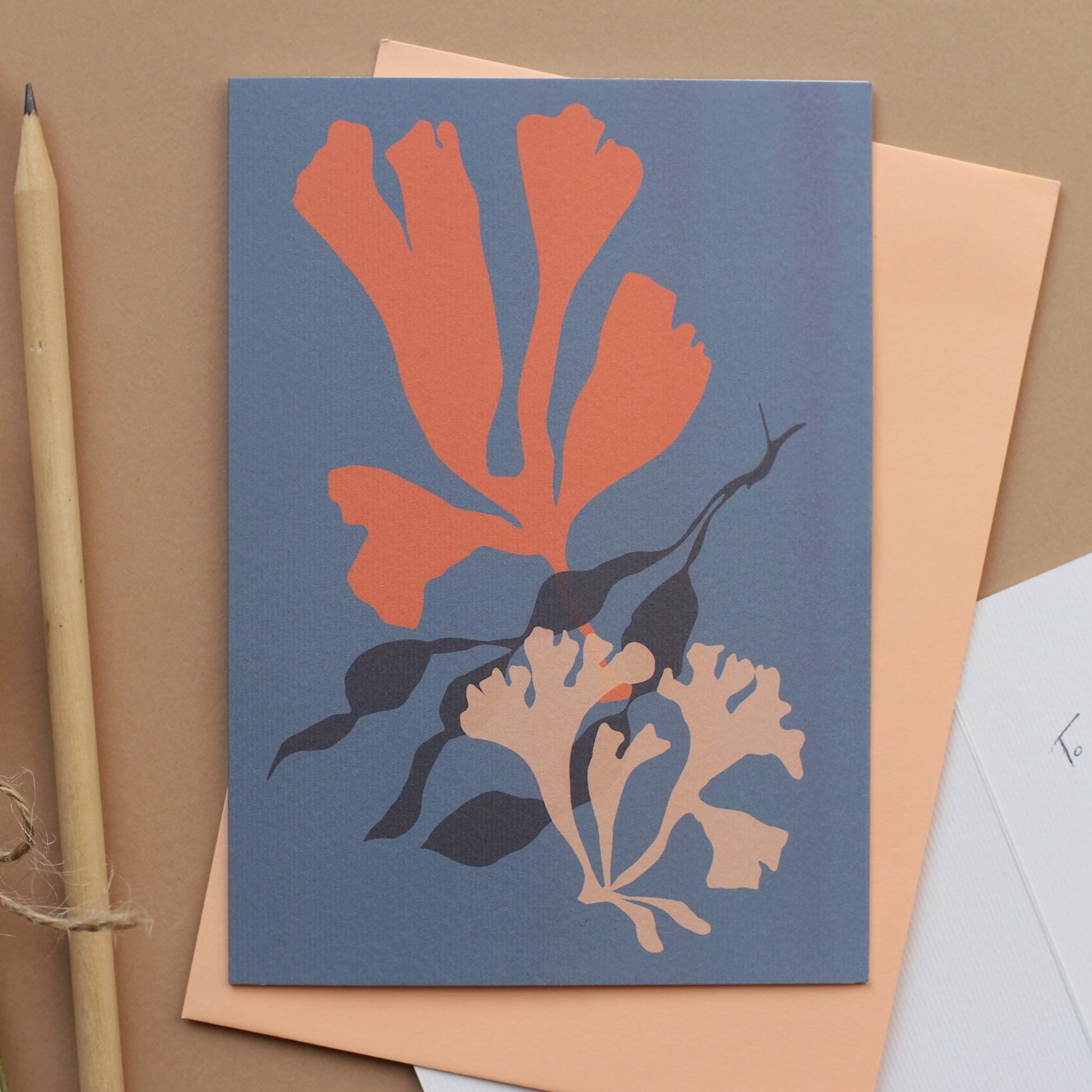 Inspired by Matisse's paper cut outs, this modern minimal art card features cut out silhouettes of sea botanicals and corals. A striking 'just because card' use it to send a note to someone special, wish a Happy Birthday or tell someone you are thinking of them.