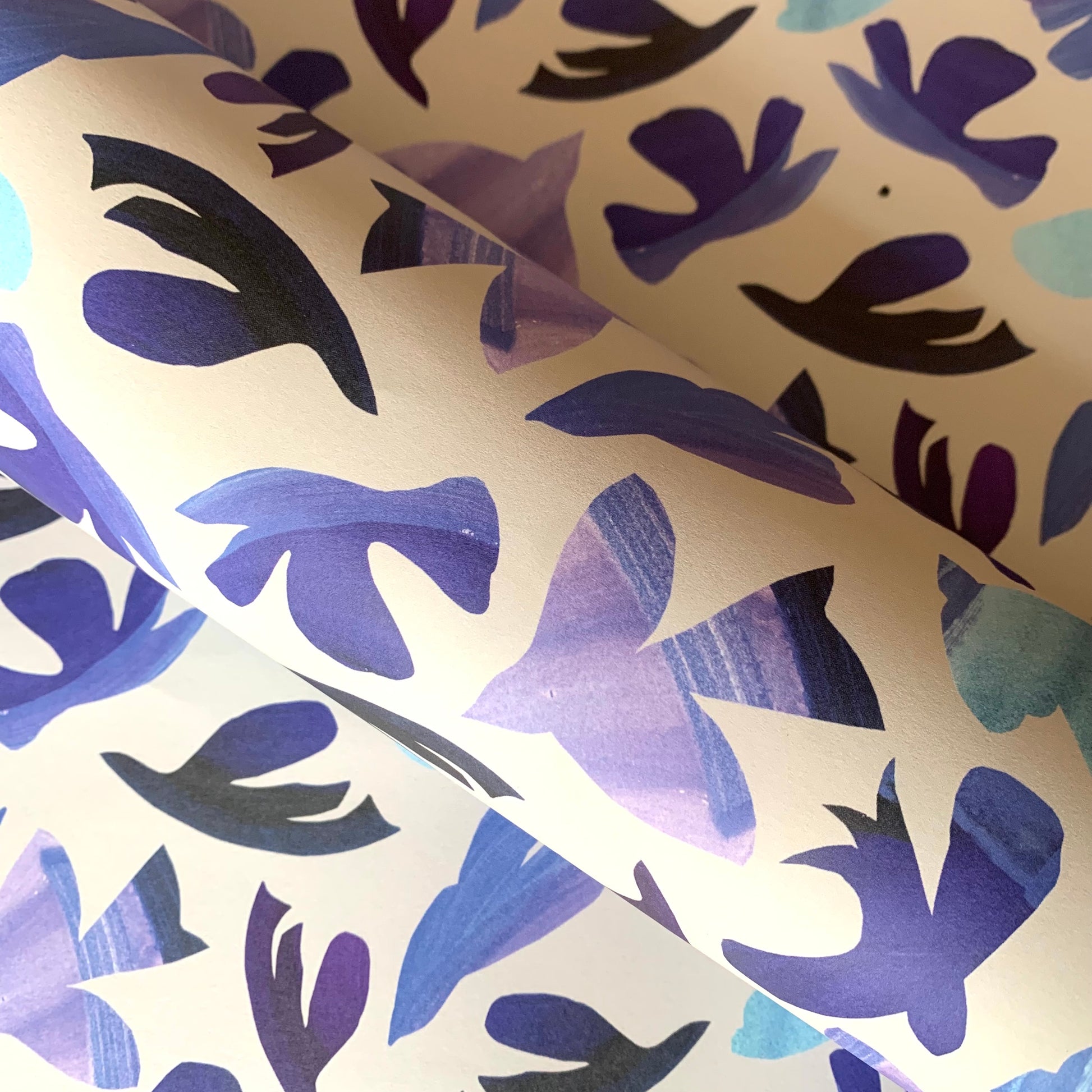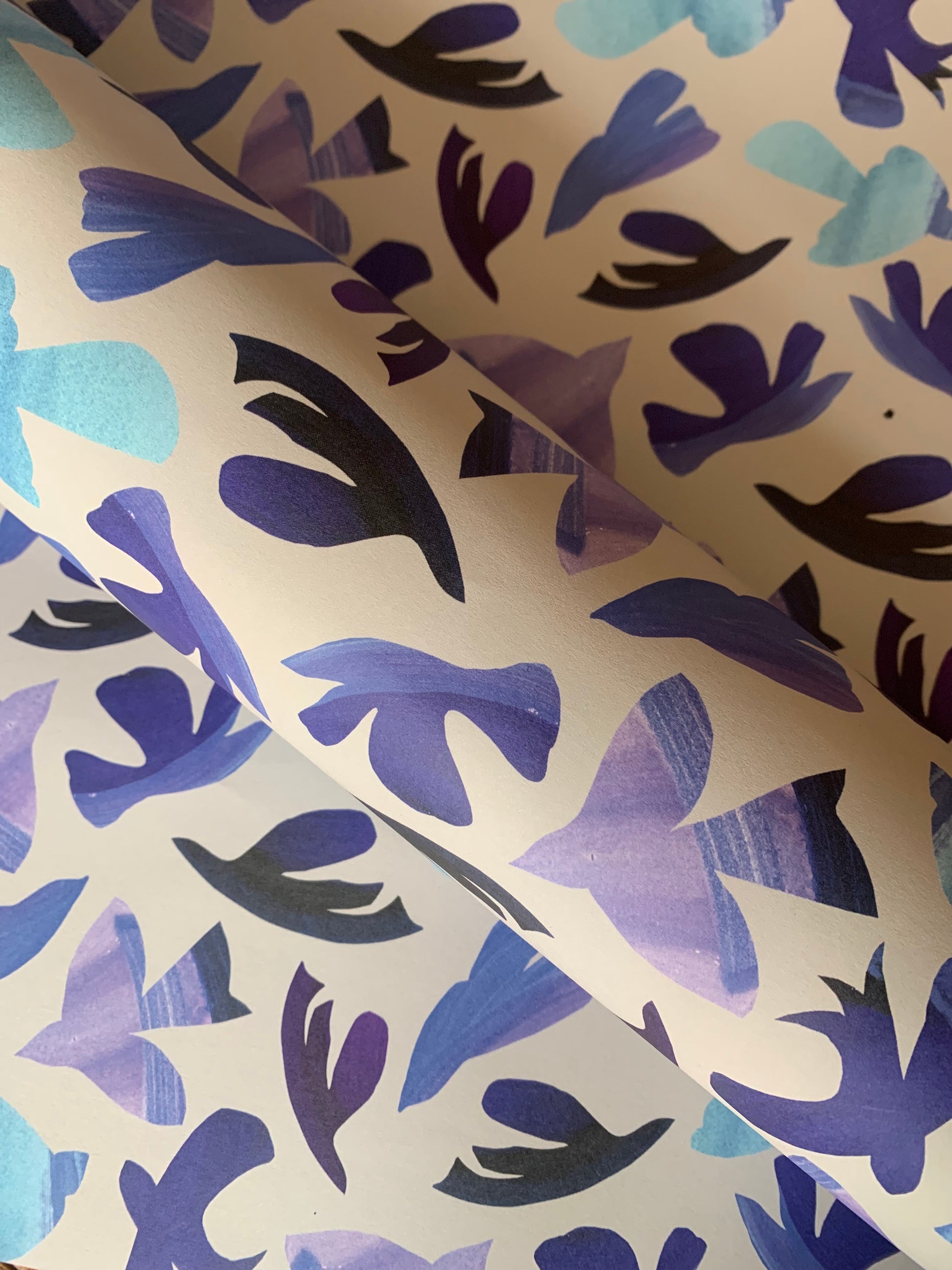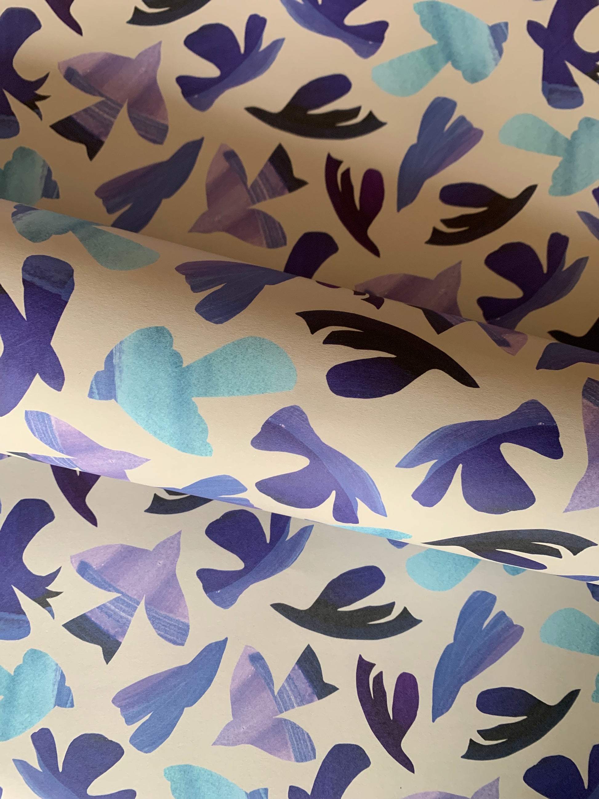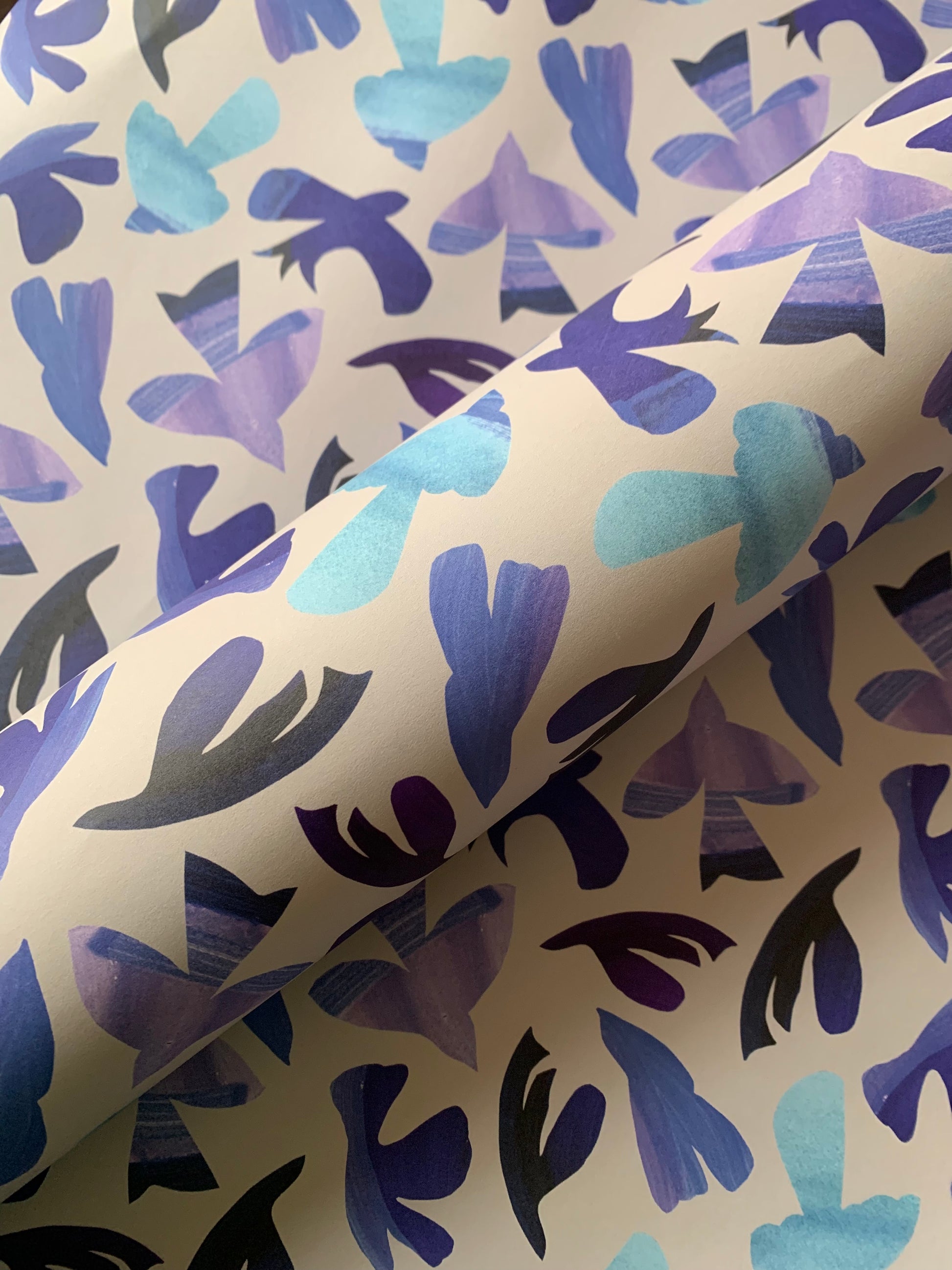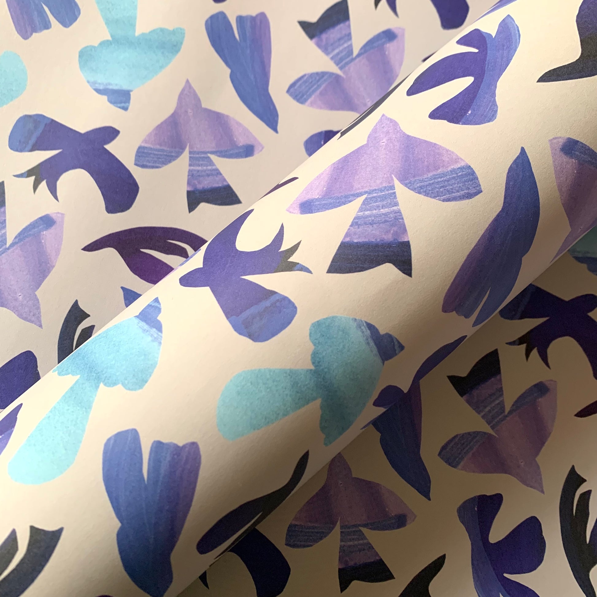 Set of 2 sheets of blue and purple dove print gift wrap.