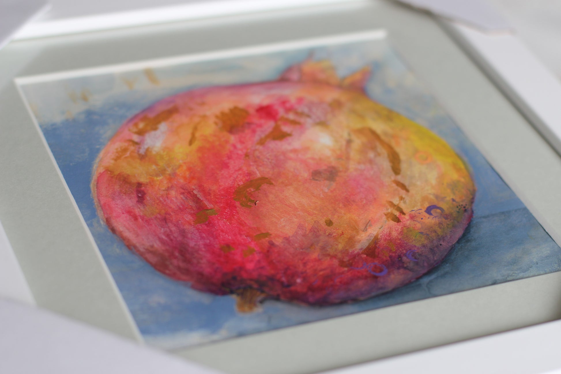 This pomegranate still life wall art is ready to frame and will fit perfectly into a standard 8 x 8 inch frame. This would look great on a kitchen wall or as part of a gallery wall alongside other botanical style illustrations.