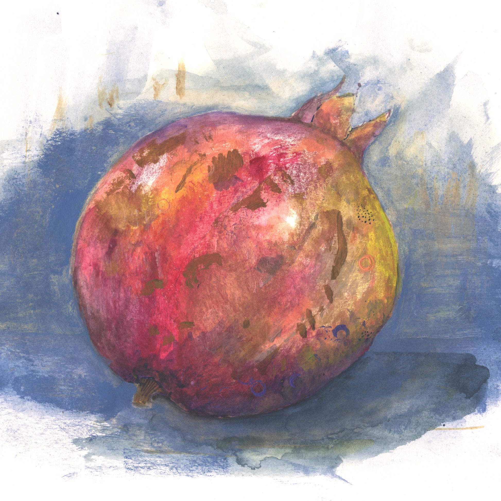 A lovely still life sketch of a pomegranate, laid on a blue table. Originally painted in acrylics and watercolour, this illustration has been digitally reproduced on museum quality etching paper and is presented in a textured off white mount.