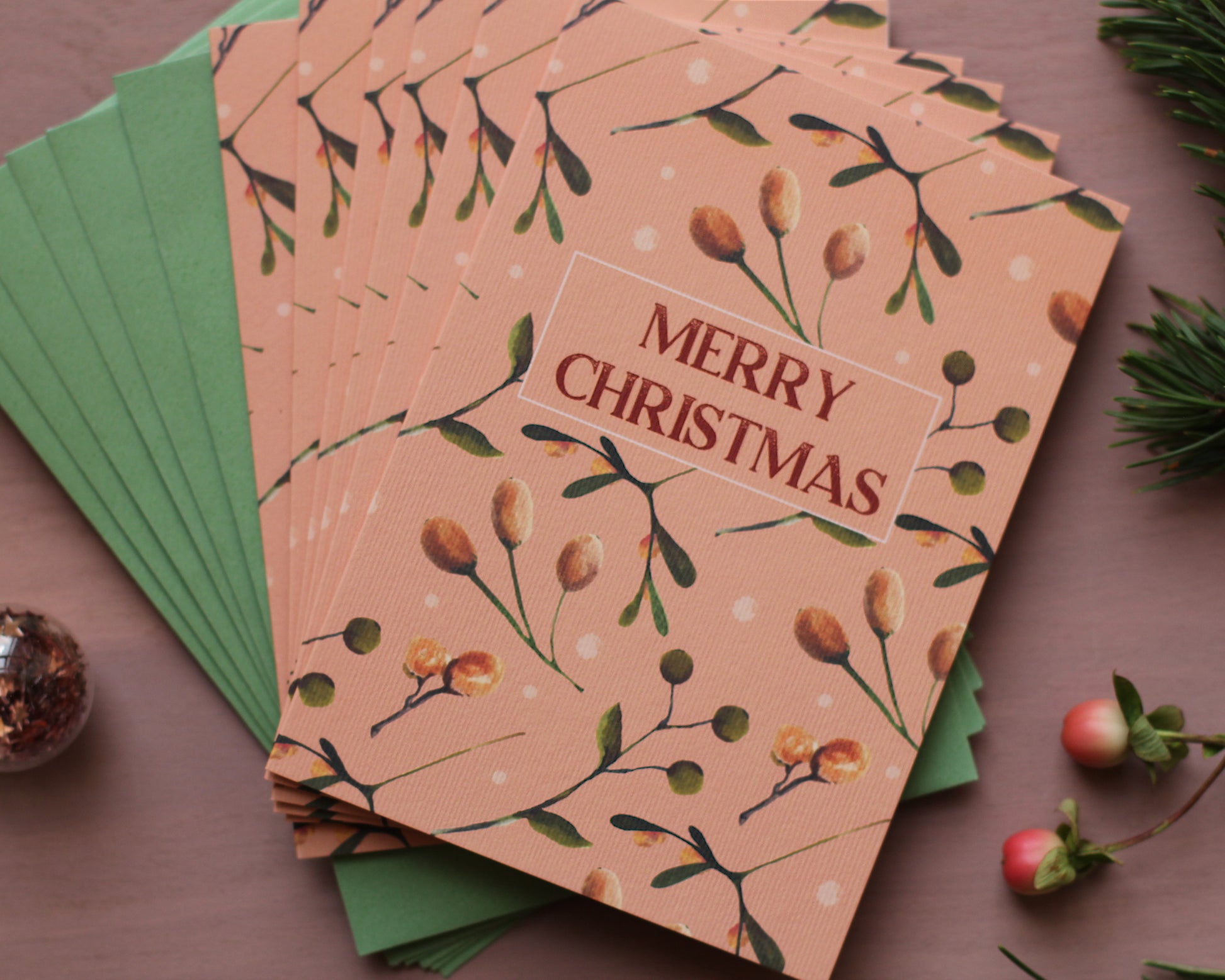 Printed on luxury textured card stock, the cards are 100% recyclable and are paired with recycled sage green envelopes. Each Christmas card is packaged in compostable wrapping.