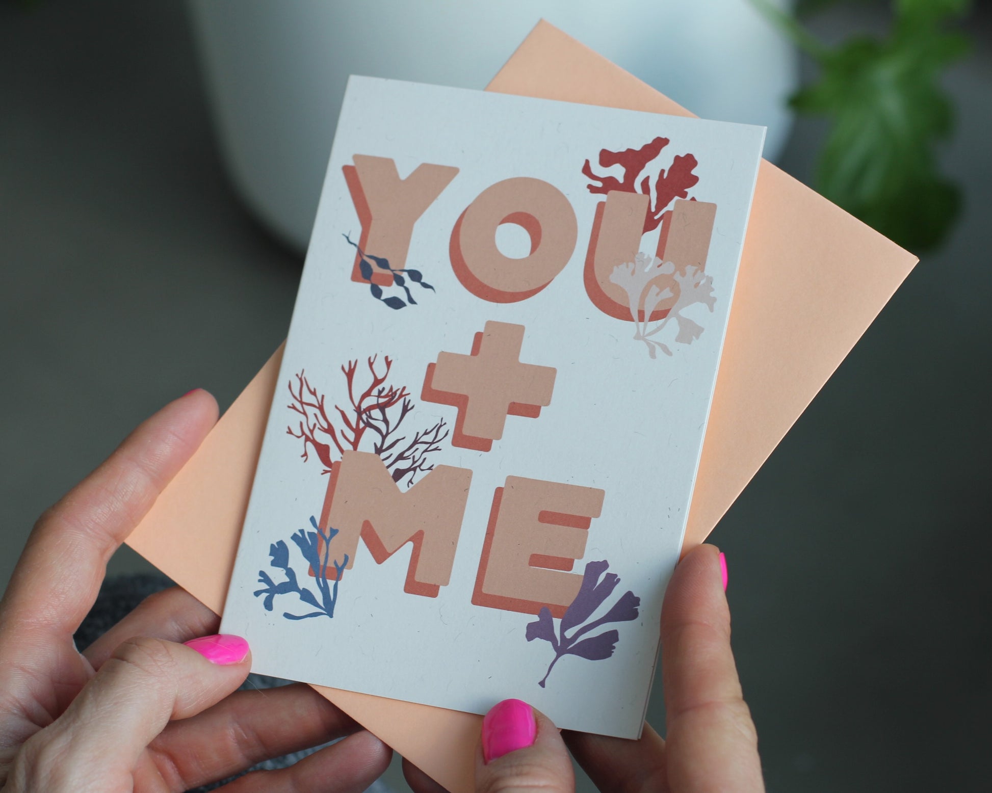 You and Me! A romantic and eco friendly card, featuring the words You + Me in bold coral coloured type, surrounded by coral and kelp illustrations. A perfect card if you have a shared love of the beach or ocean.